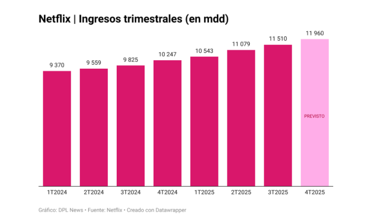Netflix presentó buenos resultados en el tercer trimestre de 2025: sus ingresos crecieron 17.2% interanual hasta 11,550 millones de dólares. Las ganancias del OTT se ubicaron en 2,547 millones de dólares y su margen operativo se ubicó en 28%,algo menos que lo previsto (31.5%),como resultado de “un gasto relacionado con una disputa tributaria con autoridades brasileñas”.