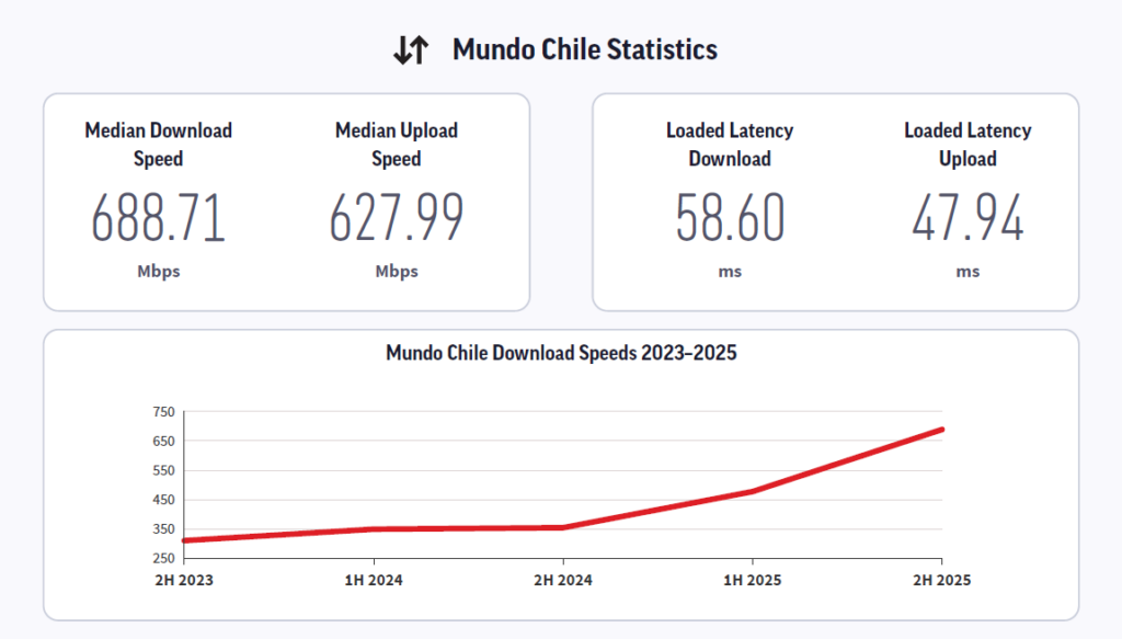 Barcelona,España. Mundo se convirtió en el operador con la red fija más rápida del planeta en 2025; obtuvo un score de 83.4 puntos en la medición de Ookla del último trimestre de ese año. La velocidad media fue de 688.7 Mbps de bajada y 627.9 de subida,con una latencia de 58.6 milisegundos. Con estos valores,la compañía local se ubicó por encima de CGates,de Lituania,y la suiza Fiber7.