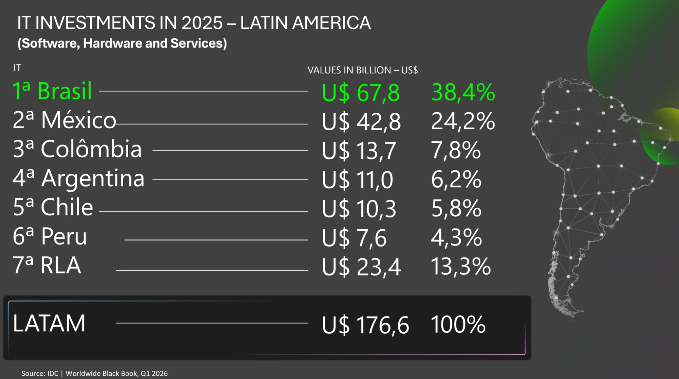 En América Latina,Brasil sigue liderando en volumen de inversiones en TI,aportando gran parte del total regional de US$ 176.6 mil millones. A nivel global,el país ocupa la 9ª posición.