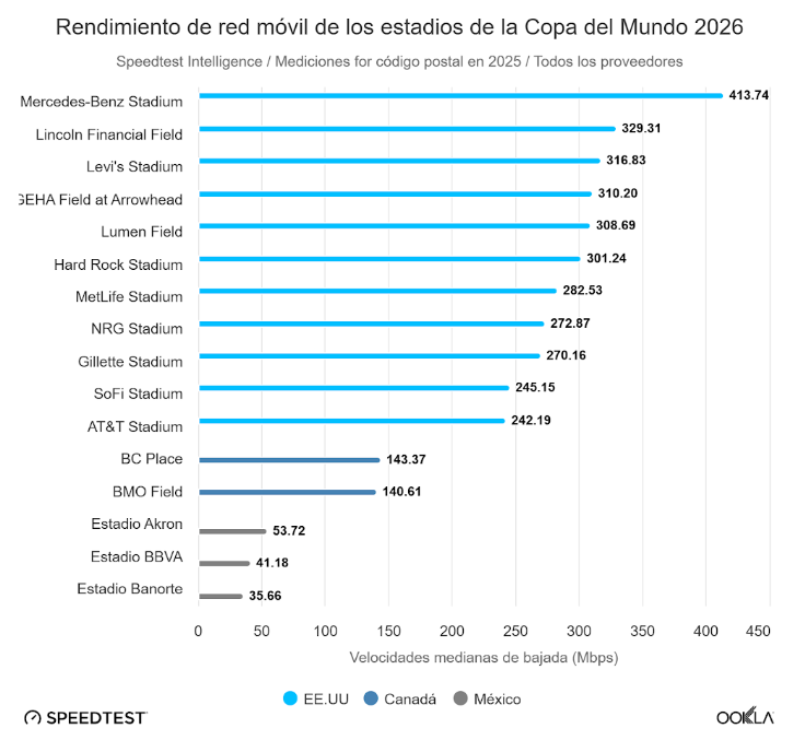 Un reciente estudio de Ookla alertó que los estadios de México ofrecerán velocidades de descarga móvil considerablemente más lentas que sus homólogos en Estados Unidos y Canadá.